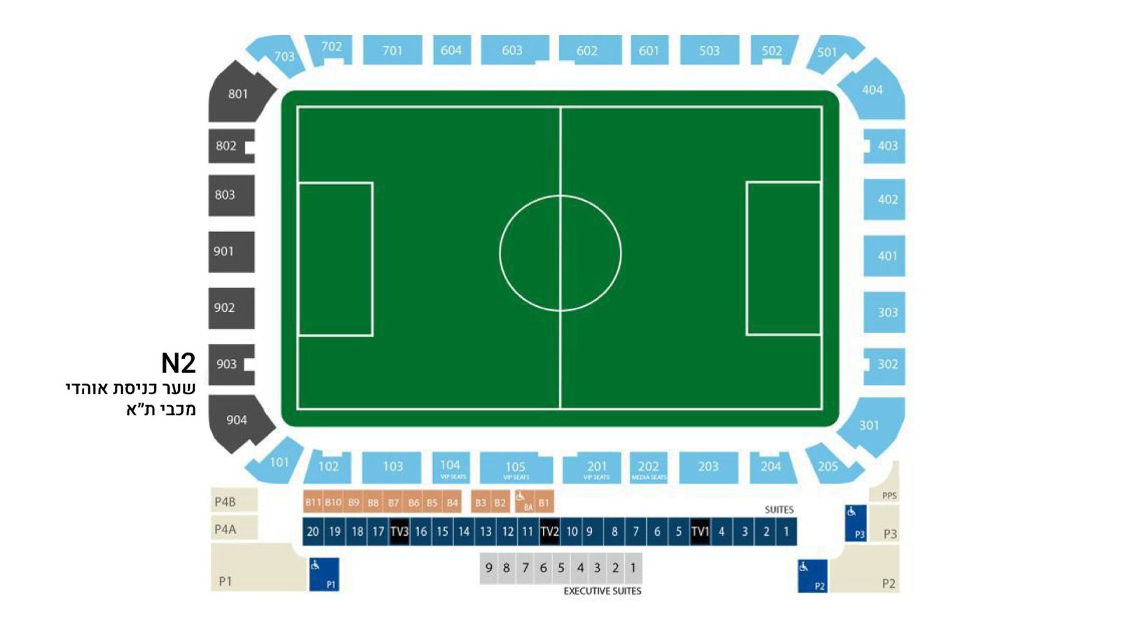 אוהדי מכבי יישבו בגושים 901-902, 803 הנמצאים מאחורי השער (ראו מפה בהמשך הכתבה). הכניסה לאוהדי מכבי תל אביב תתבצע דרך שער N2. פתיחת שערים: 18:00. בסיום המשחק יתכנו עיכובים ביציאה – בהתאם להחלטת המשטרה.