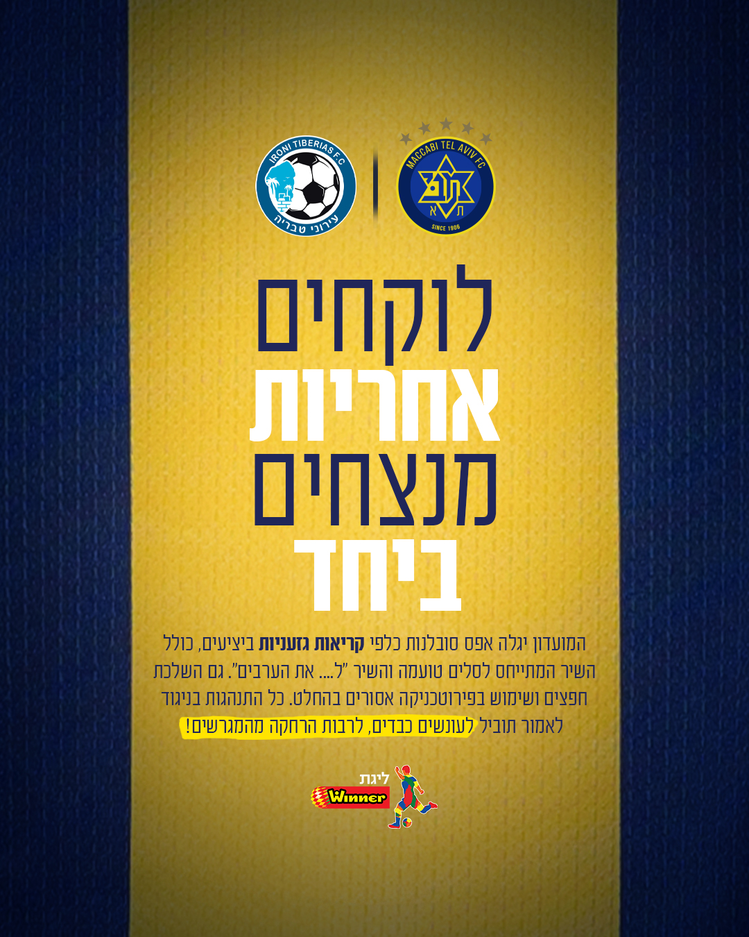 אנחנו מזכירים שלכל אחד מאיתנו יש אחריות על מעשיו ובכוחו לסייע להצלחה של מכבי. התנהגות בלתי הולמת ביציעים, גזענות, או שימוש באמל"ח ופירטוכניקה עלולים להוביל לקנסות כבדים, הורדת נקודות והרחקה מהמגרשים. בואו ננצח על הדשא, ונימנע מהפסד ביציע.