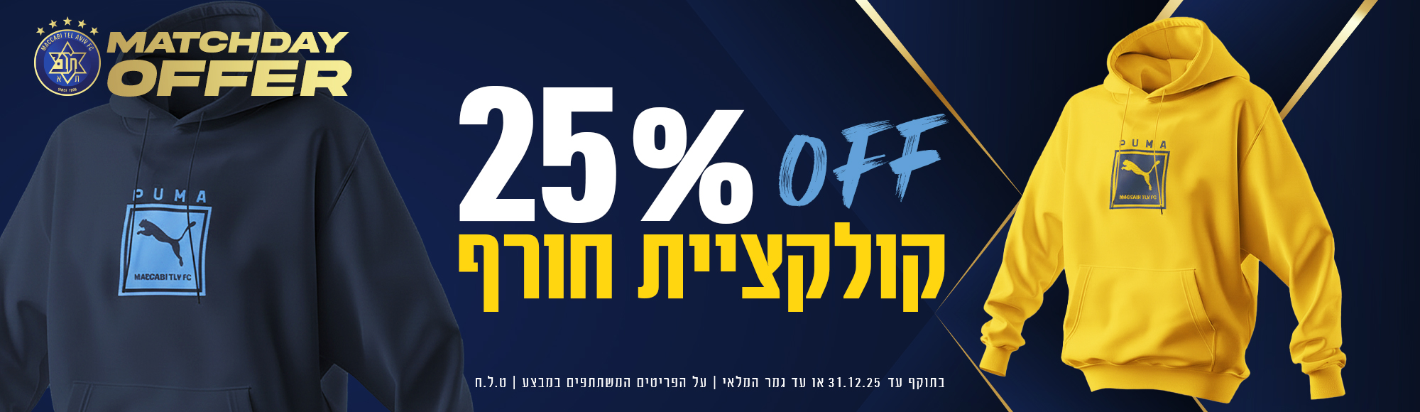 בחנות תוכלו למצוא הפעם מבצע יום משחק שיחמם אתכם – 25% הנחה על קולקציית החורף הרשמית של מכבי. בנוסף מחכה מגוון רחב של פריטי רשמיים נוספים וכן פריטי לבוש והנעלה איכותיים מבית PUMA.