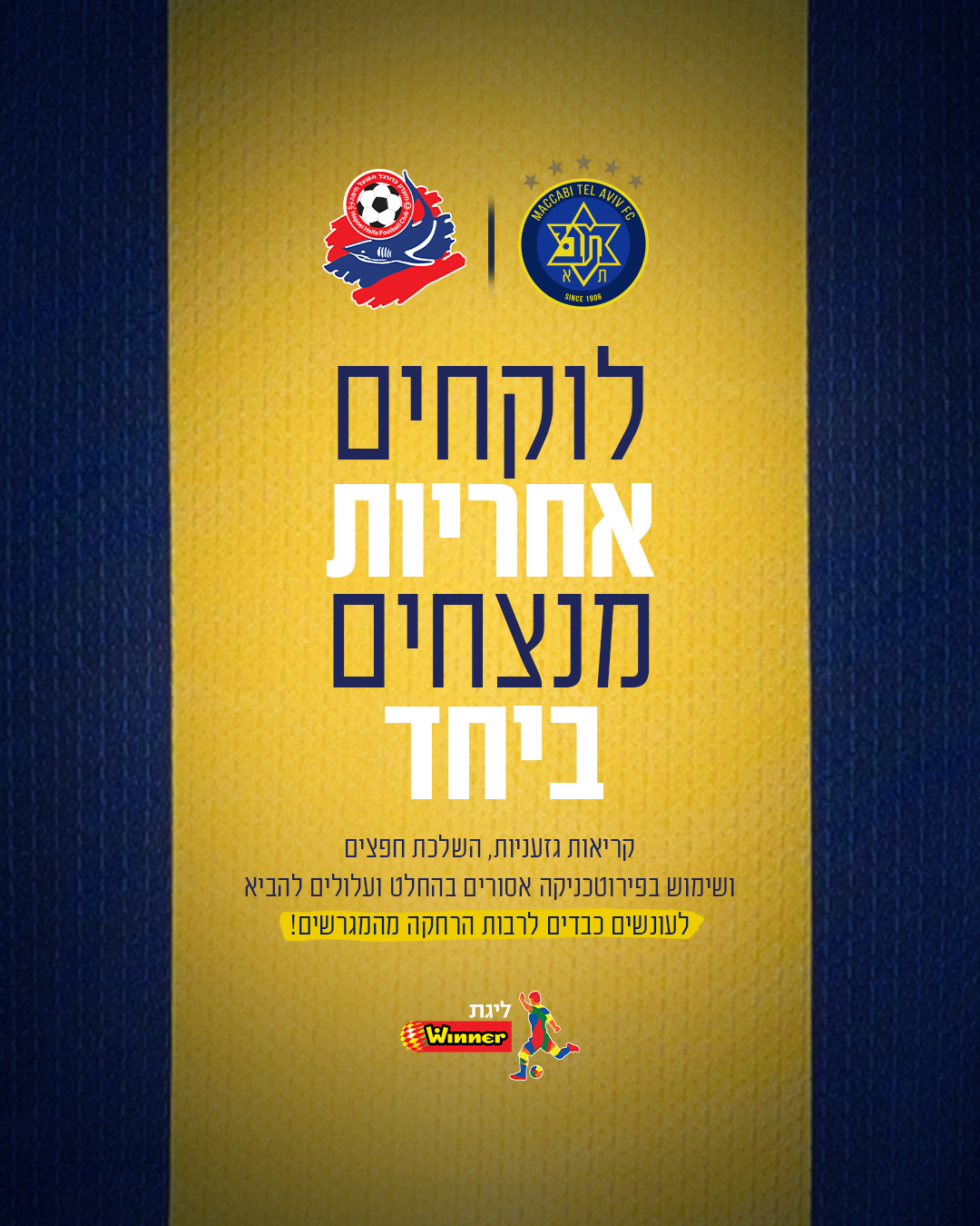 אנחנו מזכירים שלכל אחד מאיתנו יש אחריות על מעשיו ובכוחו לסייע להצלחה של מכבי. התנהגות בלתי הולמת ביציעים, גזענות, או שימוש באמל"ח ופירטוכניקה עלולים להוביל לקנסות כבדים, הורדת נקודות והרחקה מהמגרשים. בואו ננצח על הדשא, ונימנע מהפסד ביציע.