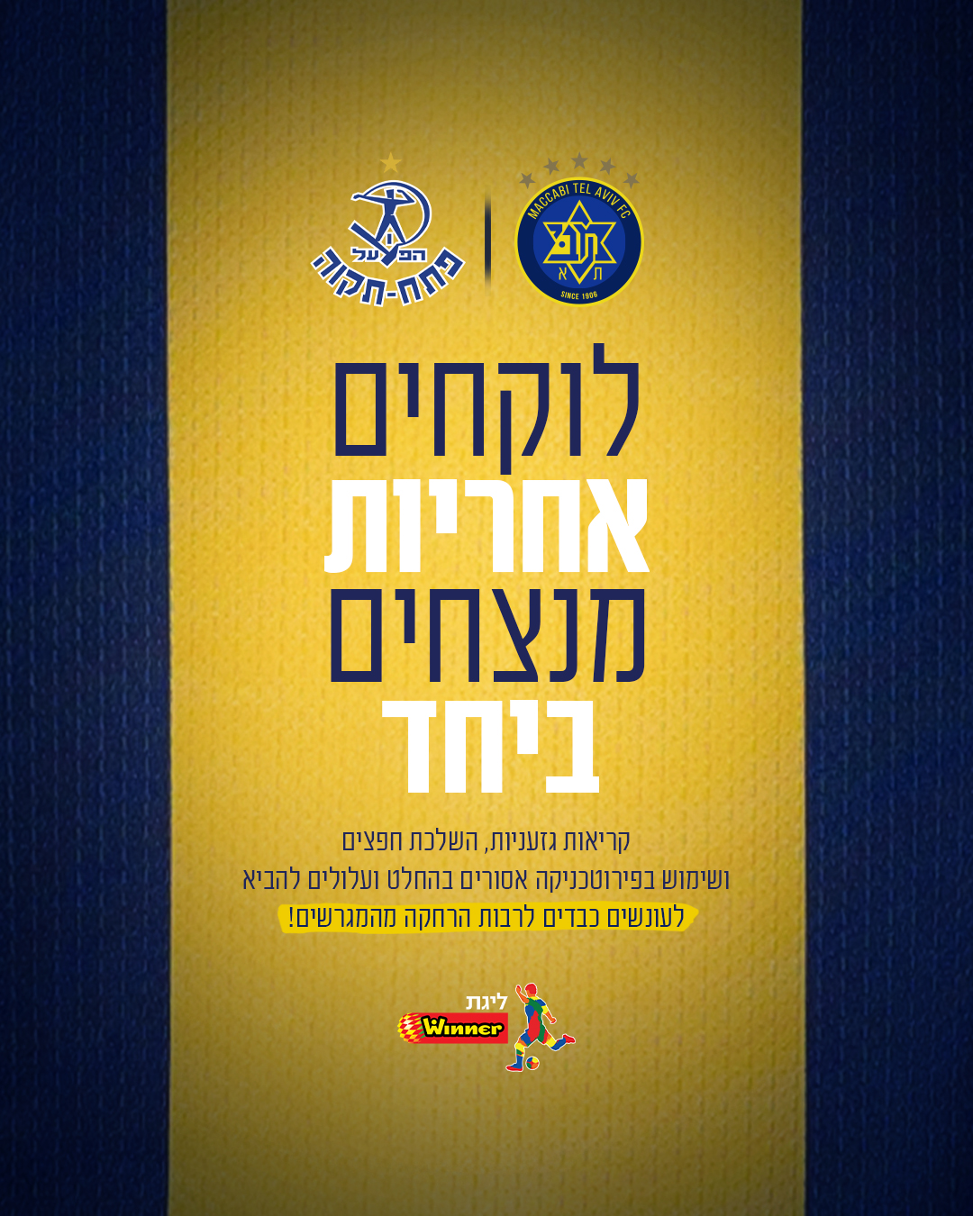 אנחנו מזכירים שלכל אחד מאיתנו יש אחריות על מעשיו ובכוחו לסייע להצלחה של מכבי. התנהגות בלתי הולמת ביציעים, גזענות, או שימוש באמל"ח ופירטוכניקה עלולים להוביל לקנסות כבדים, הורדת נקודות והרחקה מהמגרשים. בואו ננצח על הדשא, ונימנע מהפסד ביציע.