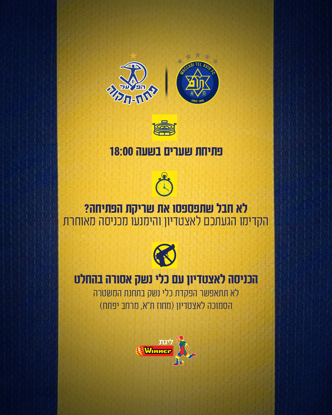אנו ממליצים מאוד להקדים את הגעתכם לאיצטדיון. כמות האוהדים עלולה ליצור עומסים בדרך לבלומפילד כמו גם בכניסה ליציעים, כך שחשוב שתתכננו הגעה מוקדמת וכך תבטיחו שתימנעו מעיכובים שיובילו אתכם לכניסה מאוחרת לאצטדיון.