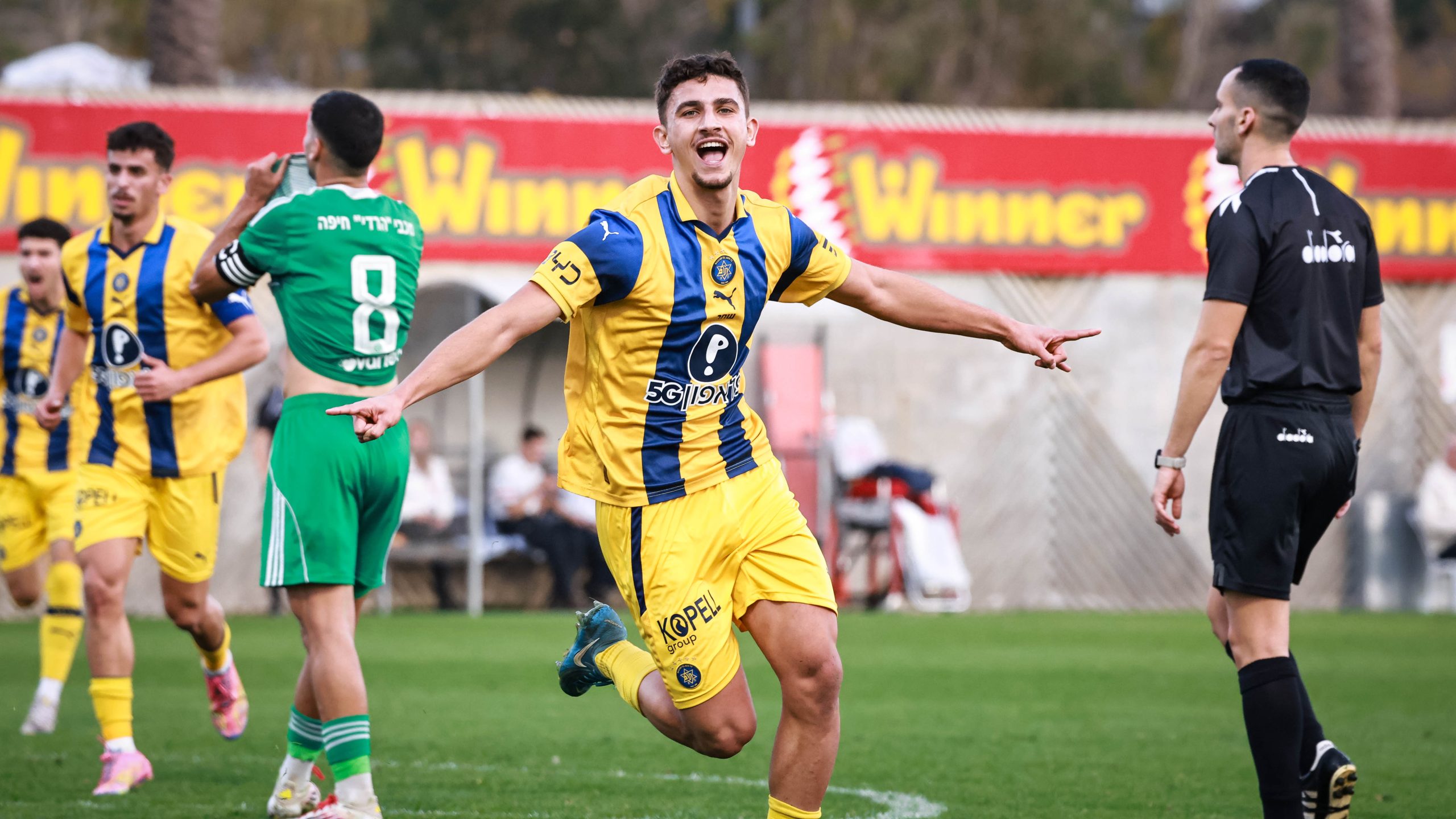 פתיחה סוערת של הצהובים. כדור שחזר מאמצע הרחבה בדקה ה-7 הגיע לעברו של עידן וינברג, שבבעיטת וולה חדה מצא את השער והעלה את מכבי ליתרון מוקדם.