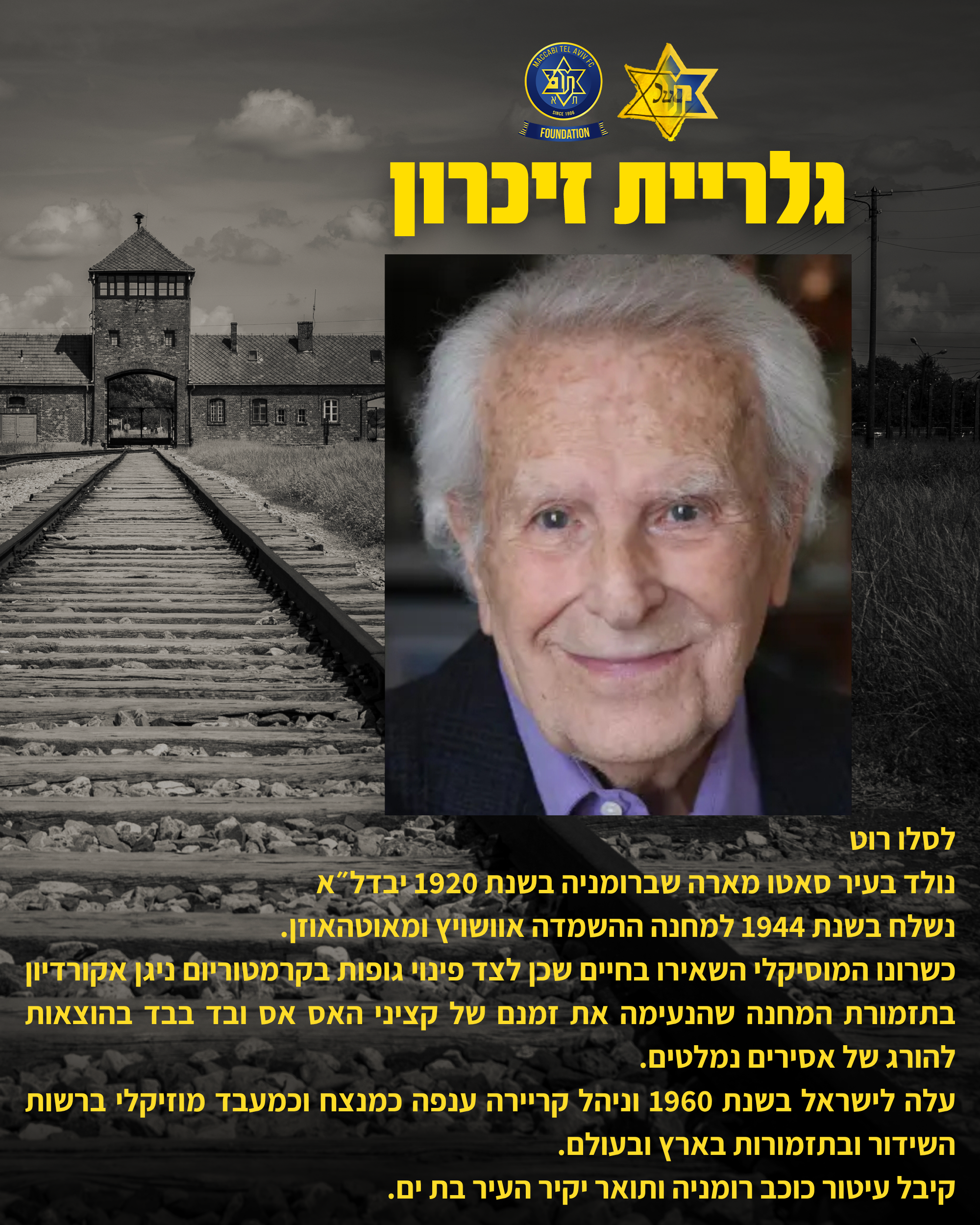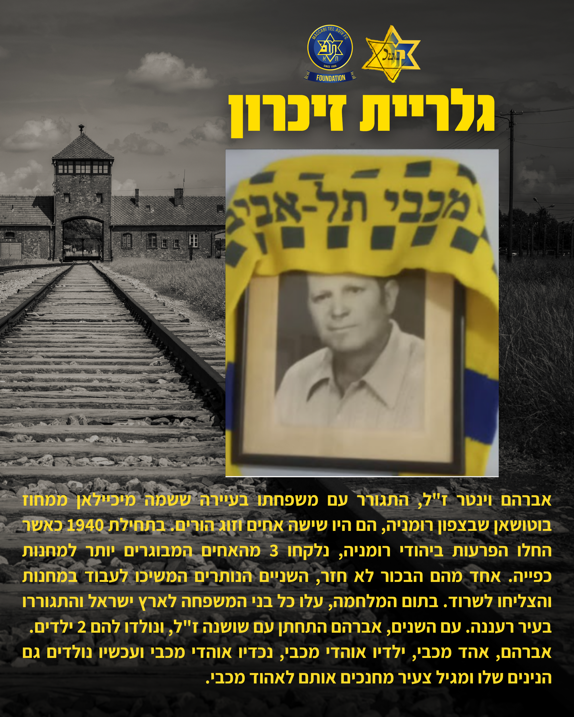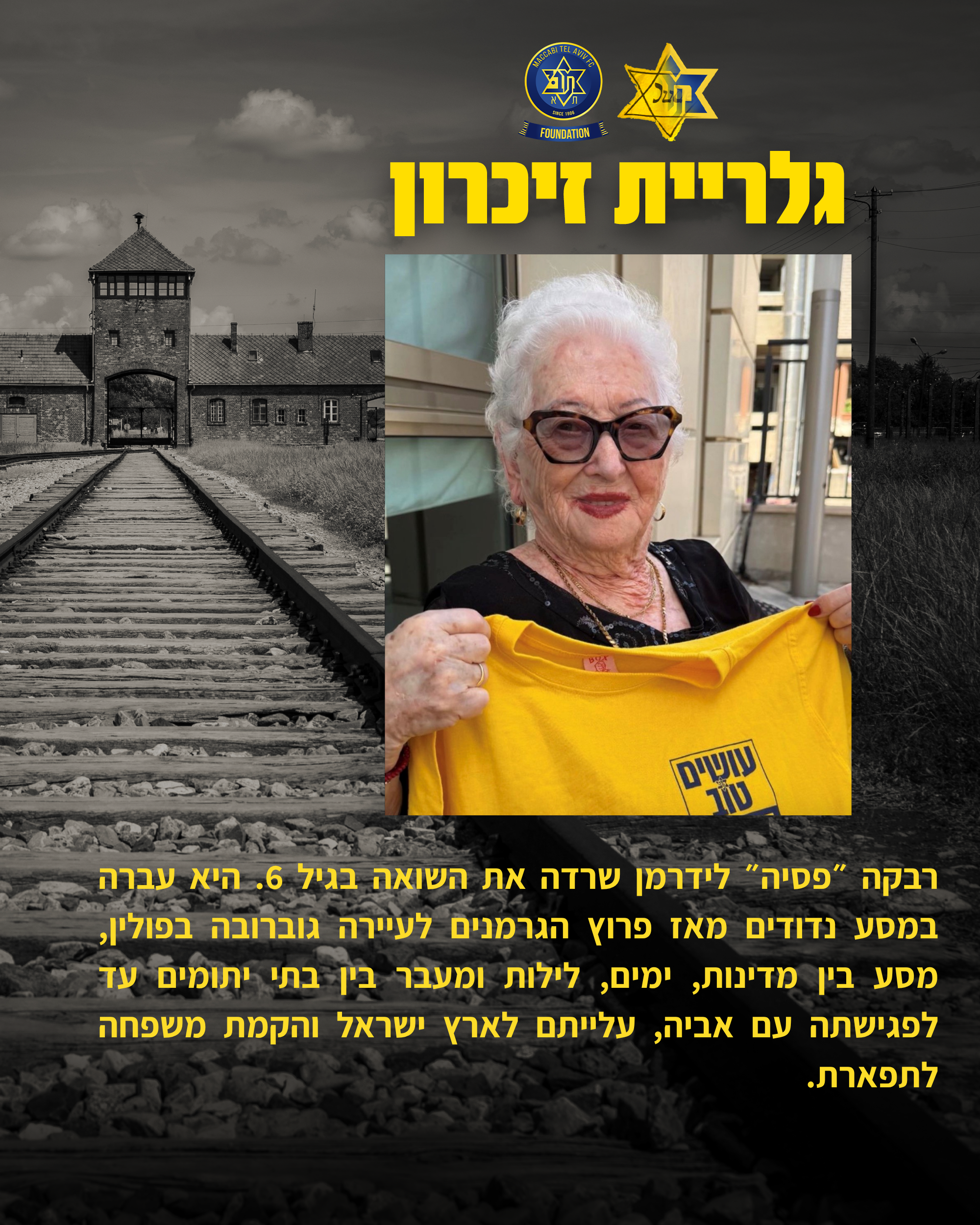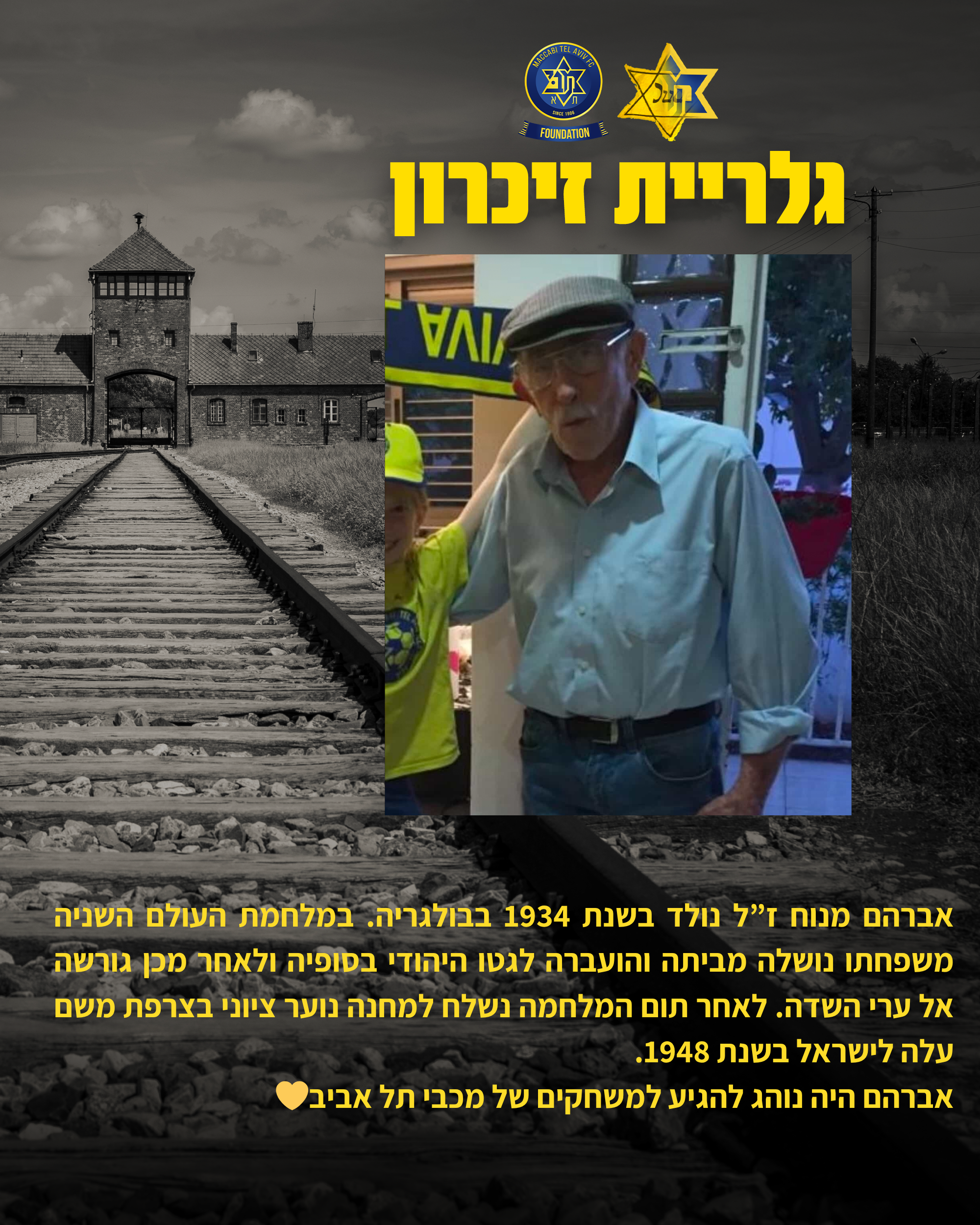 לרגל יום הזיכרון לשואה ולגבורה קרן מכבי תל אביב (ע"ר) ואוהדי הקבוצה ממשיכים גם השנה את פרויקט ההנצחה. מדובר בפרויקט שהתחלנו לפני שנתיים ובמסגרתו אוהדים של מכבי המשיכו לשתף בסיפורים של קרוביהם ויצרו גלריית זיכרון מיוחדת שעתידה ללוות אותנו גם בשנים הבאות.