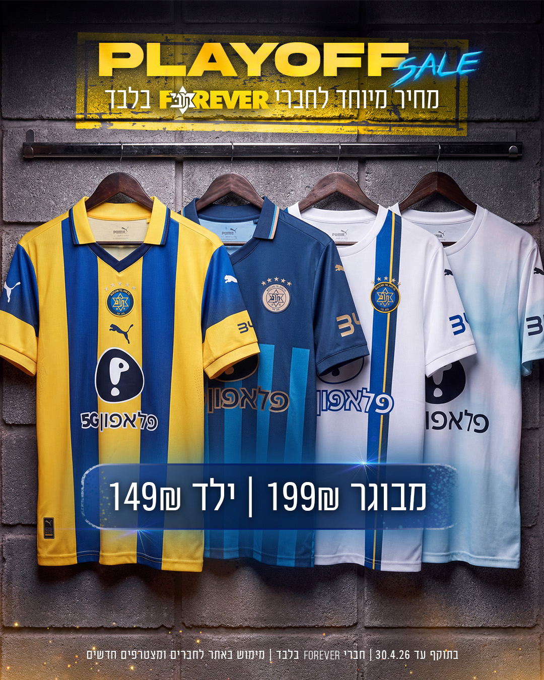 בחנות תוכלו למצוא הפעם מבצע יום משחק לחברי FOREVER – חולצות המשחק הרשמיות במחיר של 199 ש״ח למבוגר ו-149 ש״ח לילד. בנוסף מחכה מגוון רחב של פריטים רשמיים נוספים וכן פריטי לבוש והנעלה איכותיים מבית PUMA.